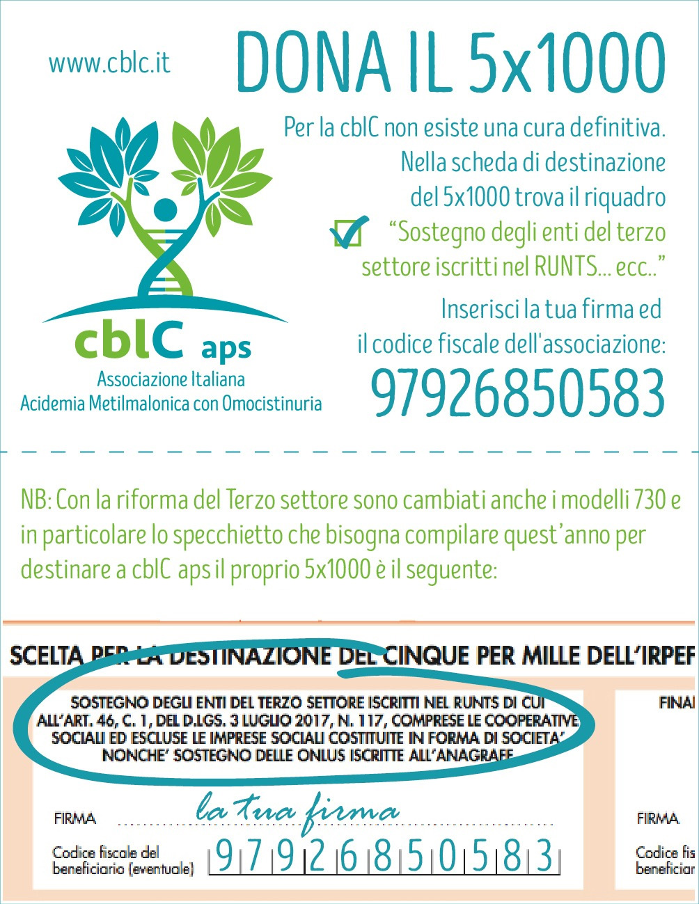 Il 5×1000 è una scelta che NON COSTA NULLA, pur essendo un aiuto fondamentale per un’associazione neonata come la cblC aps. Non costa nulla perché consiste in una piccola parte (il 5 per mille!) dell’IRPEF, dunque NON È UNA QUOTA AGGIUNTIVA rispetto a ciò che già bisogna pagare. Si tratta di una trattenuta che anziché essere incassata dal Fisco, può essere destinata all’associazione o all’ente che si preferisce. È sufficiente, in occasione della compilazione della dichiarazione dei redditi, apporre la propria FIRMA ed il CODICE FISCALE dell’associazione.